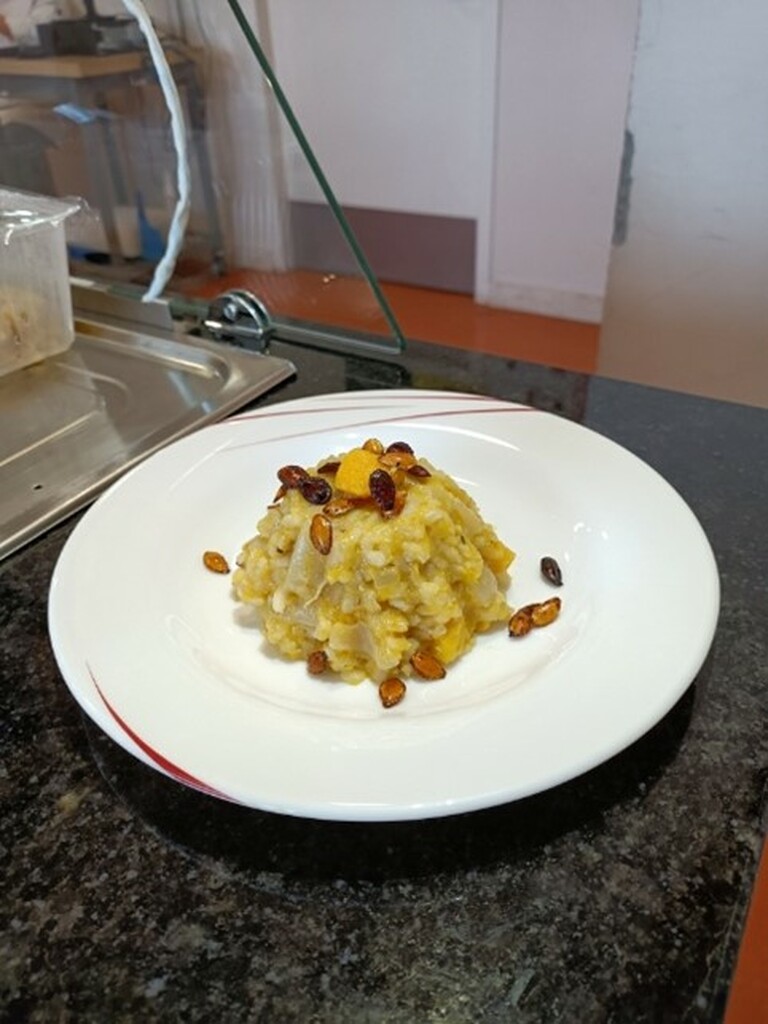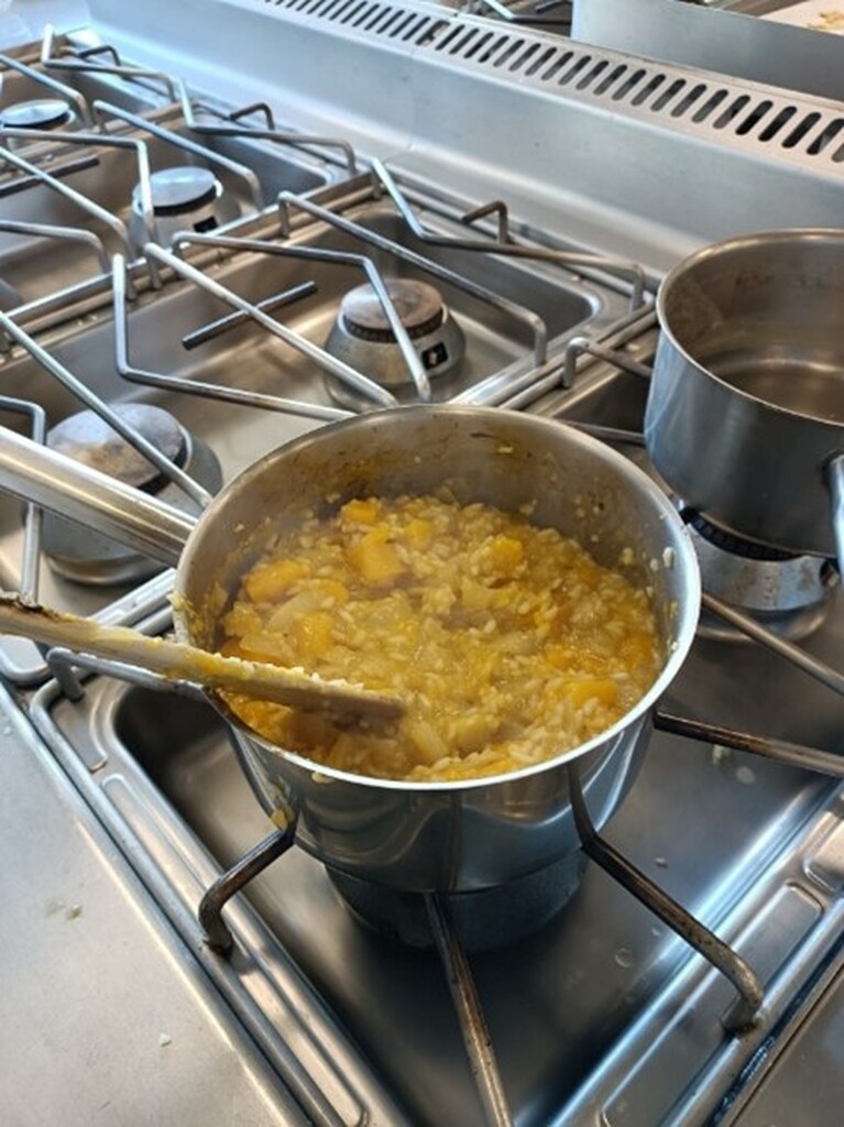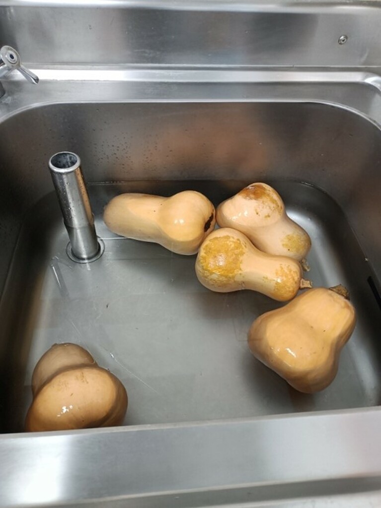 En atelier, les règles d’hygiène alimentaires sont importantes, les butternuts n’ont pas échappé au bain décontaminant !